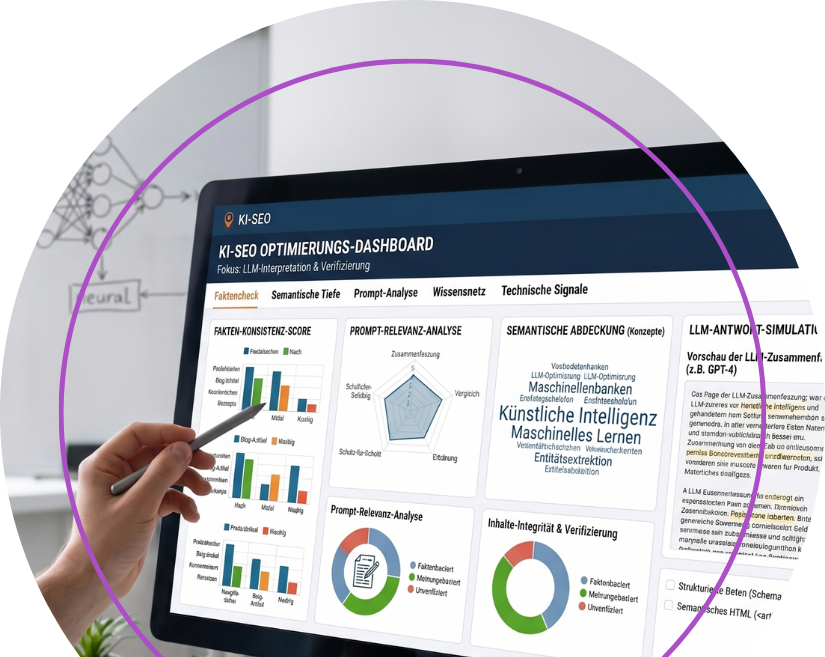 Inhaltsformate, Quellen-Signale, Semantik strukturierte Daten, Entity-Klarheit. Wir prüfen, ob deine Texte die Zitierkriterien der LLMs erfüllen.